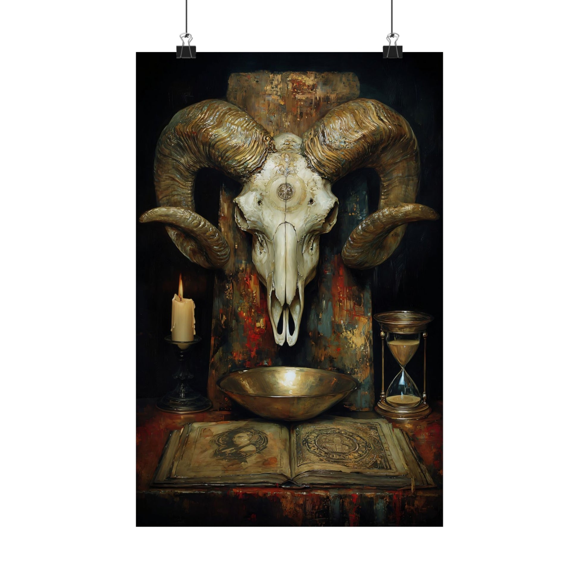 This art print features a ram’s skull mounted at the center of a ritual altar, surrounded by powerful symbols of time, magic, and mortality. A candle burns low beside an ancient grimoire, while an hourglass marks the passage of fate. A bronze ritual bowl gleams, reflecting the shadows of the skull. Together, these elements evoke the atmosphere of witchcraft rites, occult ceremonies, and memento mori traditions.
