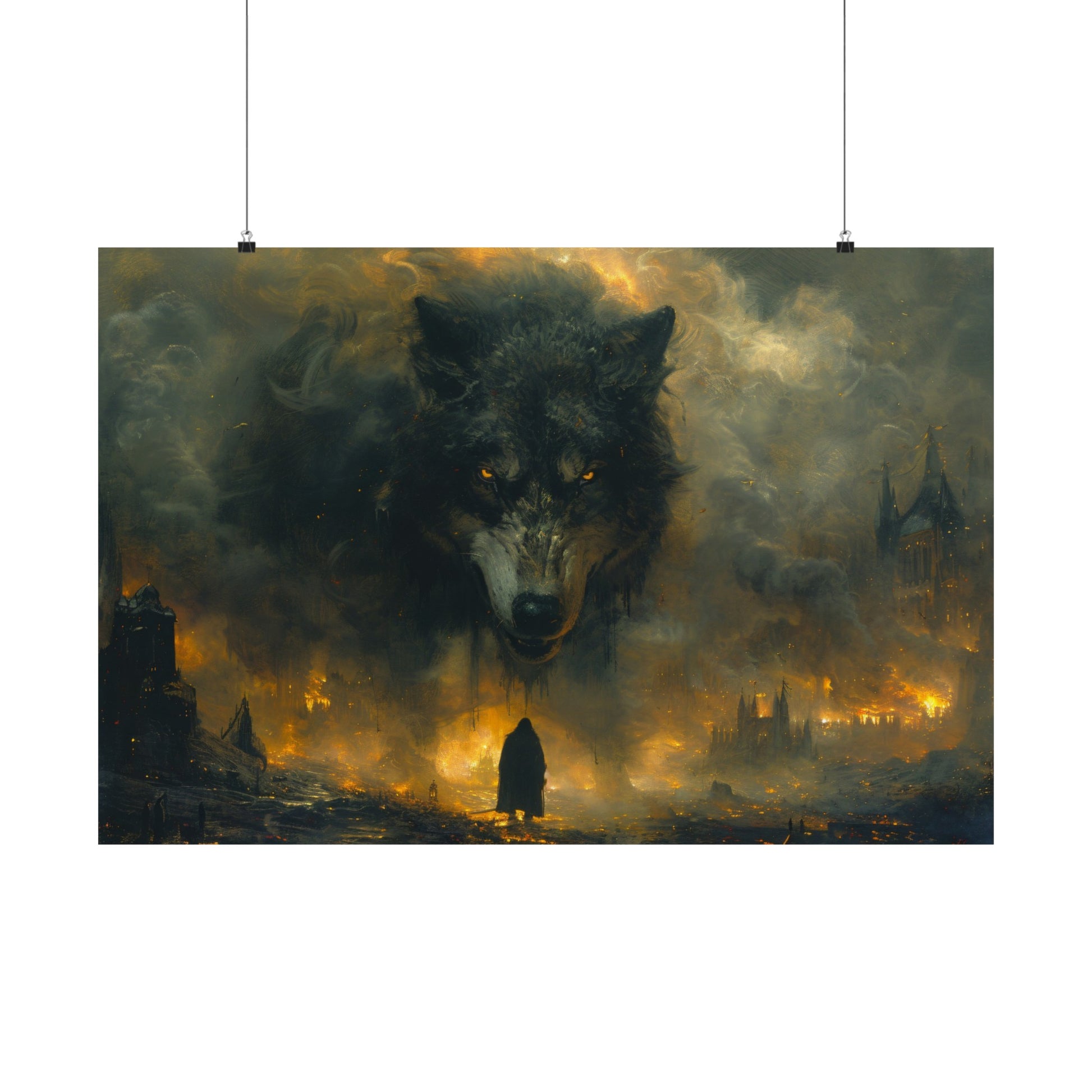 Unleash the raw power of Norse mythology with this striking art print of Fenrir, the fearsome wolf destined to play a pivotal role during Ragnarok. According to legend, Fenrir's immense strength and ferocity are unmatched, and his escape from bondage marks the beginning of the end for the gods, leading to the fiery destruction of Asgard. This art piece dramatically captures Fenrir amidst the chaos and flames of Ragnarok, reflecting his formidable presence as he roams through the crumbling ruins of Asgard.