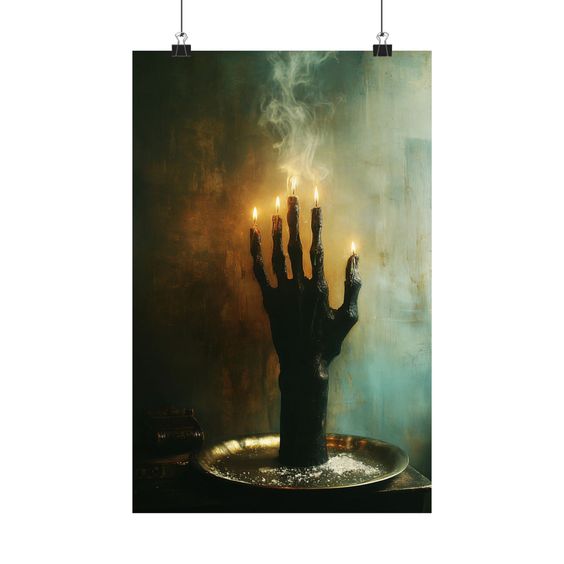 The legendary Hand of Glory burns with sinister light in this haunting art print. A mummified hand, transformed into a candle of sorcery, glows with flickering flames at each fingertip, smoke curling into the air like whispered spells. Resting upon a silver tray, this infamous tool of thieves and witches radiates forbidden magic and eerie beauty. In folklore, the Hand of Glory was believed to unlock any door and render all who saw it motionless. This artwork captures that dark myth, blending gothic elegance with occult history—perfect for witches, collectors of esoterica, and lovers of sinister décor.
