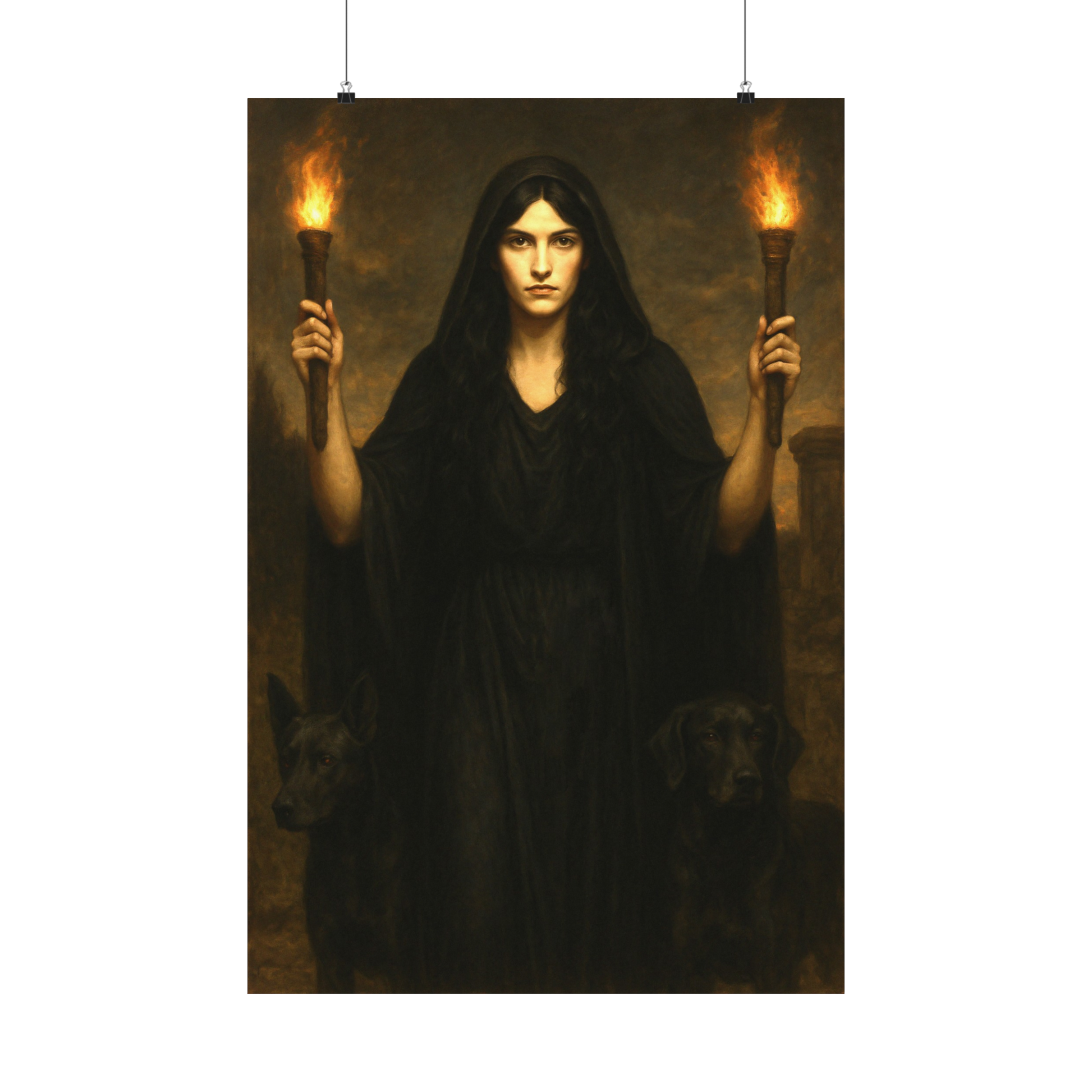Illuminate your sacred space with this evocative Hecate Art Print, part of the Arcanum Nocturne series—a dark collection inspired by myth, magic, and classical oil painting. This piece portrays Hecate, the Greek goddess of witchcraft, crossroads, and the moon, holding her twin torches as she stands with two black hounds, her sacred companions and spirit guardians.