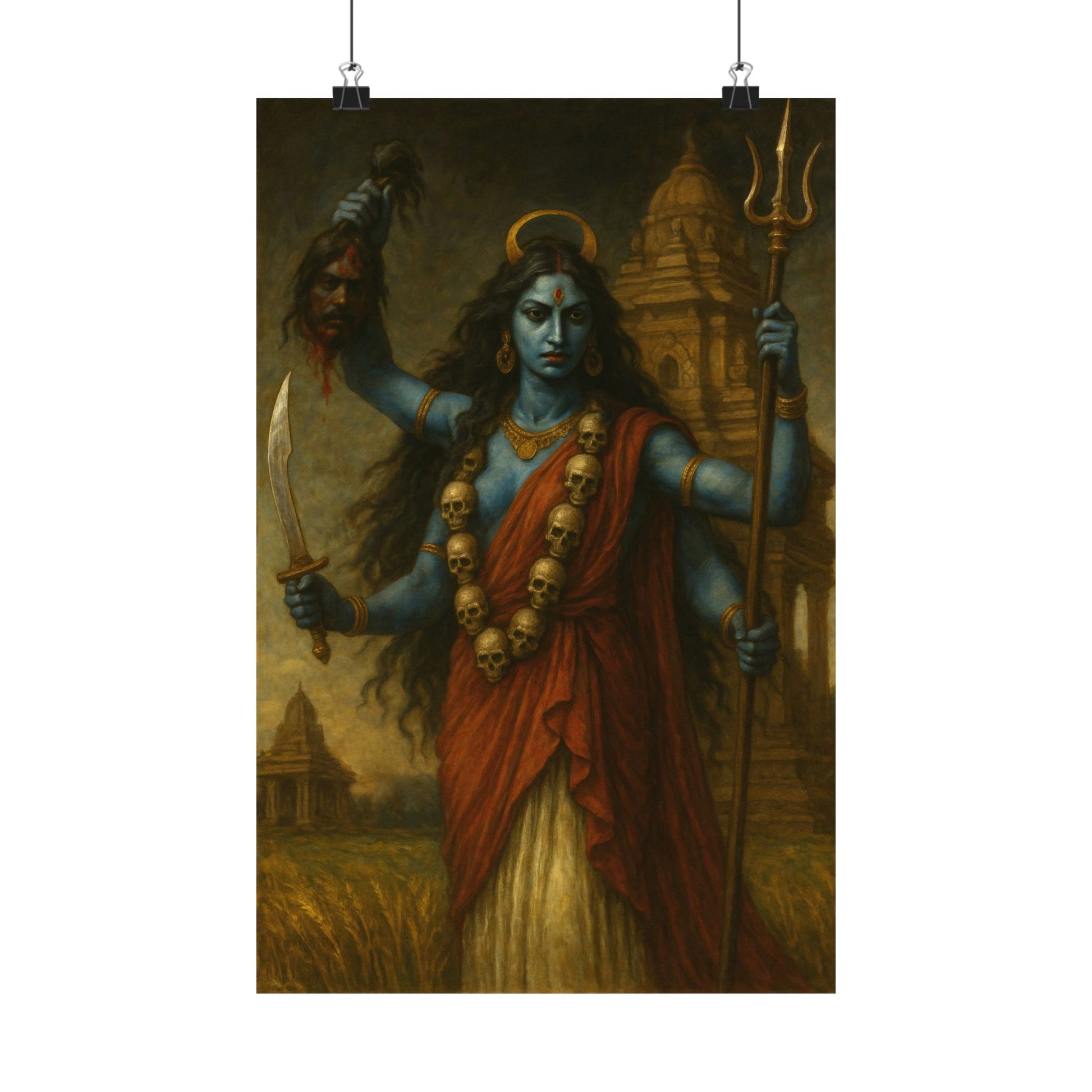 Channel the unstoppable force of divine feminine rage with this electrifying Kali Art Print, part of the Arcanum Nocturne series—our fine art collection of mythological icons rendered in the painterly tradition of academic and symbolist masters. This piece features Kali Ma in her battle form, standing triumphant with four arms wielding ancient weapons and holding the severed head of the demon Raktabija, with Indian temples rising in the background.