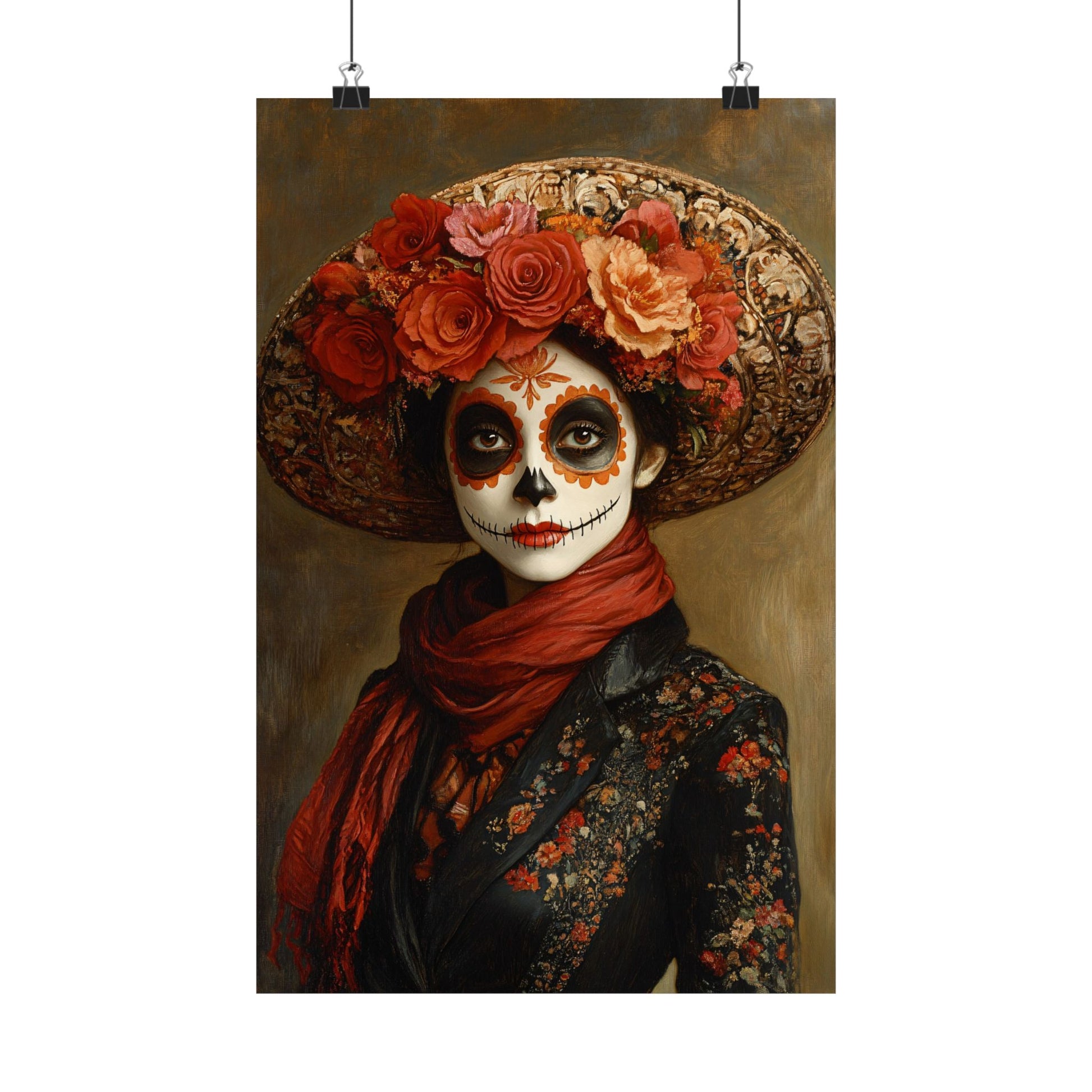 Celebrate the beauty and symbolism of Mexico’s Día de los Muertos with this striking La Catrina Art Print. Inspired by José Guadalupe Posada’s iconic La Calavera Catrina, this piece reimagines the elegant “Lady of Death” with rich detail and vibrant tradition. Adorned in a wide-brimmed sombrero overflowing with roses, delicate calavera face paint, and ornate embroidered attire, La Catrina serves as both a cultural icon and a reminder of the unity between life and death. The figure of La Catrina has become synonymous with Day of the Dead celebrations, symbolizing acceptance of mortality and the honoring of ancestors. Originally conceived as social satire, she has grown into a powerful emblem of Mexican identity and remembrance, embodying both reverence and festive joy. Perfect for lovers of Day of the Dead art, gothic home décor, cultural celebrations, and collectors of unique skull and skeleton artwork.