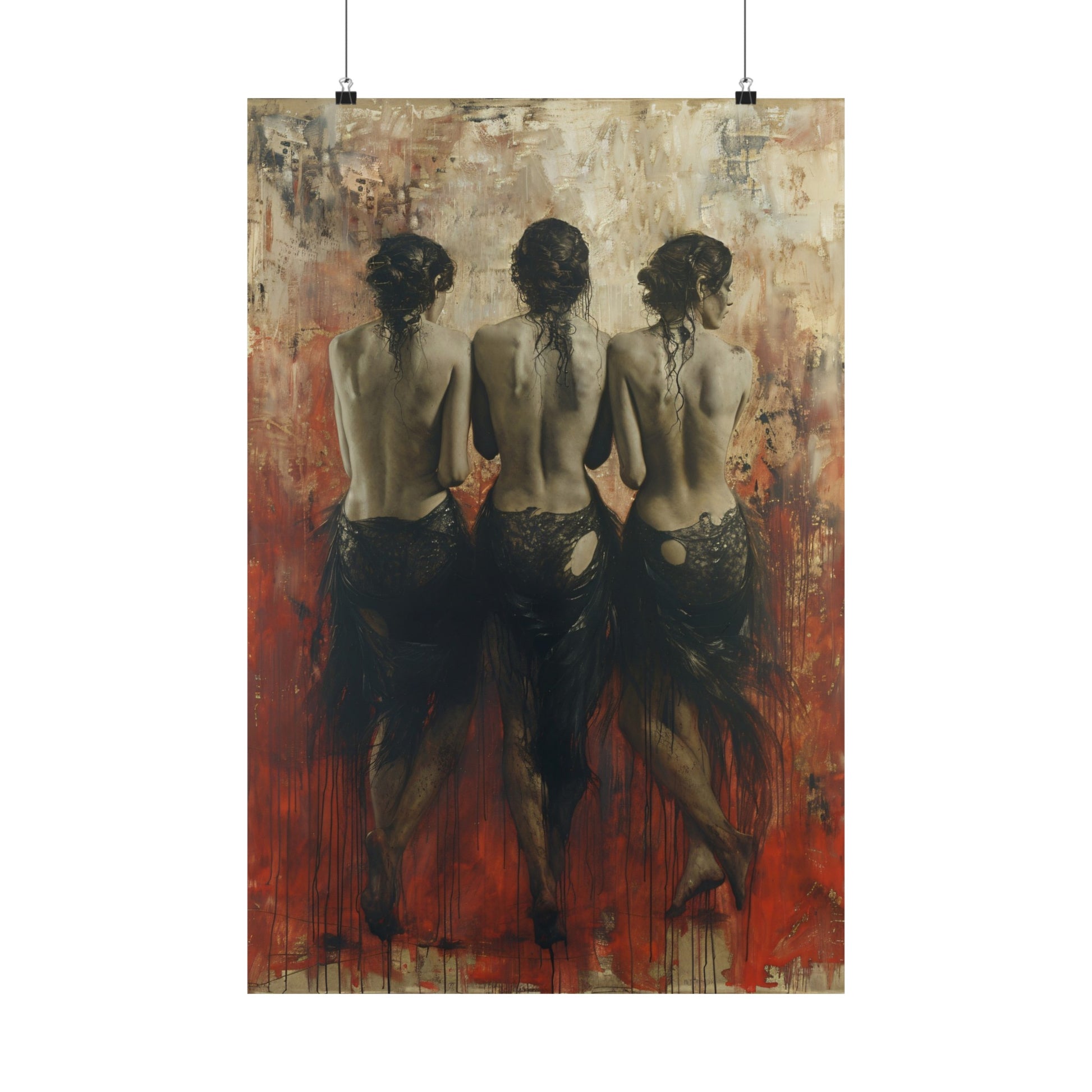 Immerse yourself in the dark, powerful world of Greek mythology with this striking art print of the Erinyes, also known as the Furies. These formidable chthonic goddesses, depicted in a hauntingly beautiful scene, embody vengeance and retribution, serving as ancient symbols of justice and moral order. In Greek mythology, the Erinyes were born from the blood of Uranus when he was overthrown by his son, Cronus. These relentless deities pursued those who committed heinous crimes, especially those who shed familial blood. Often depicted as fearsome figures with serpents entwined in their hair and torches or whips in their hands, the Furies instilled terror in the hearts of wrongdoers.