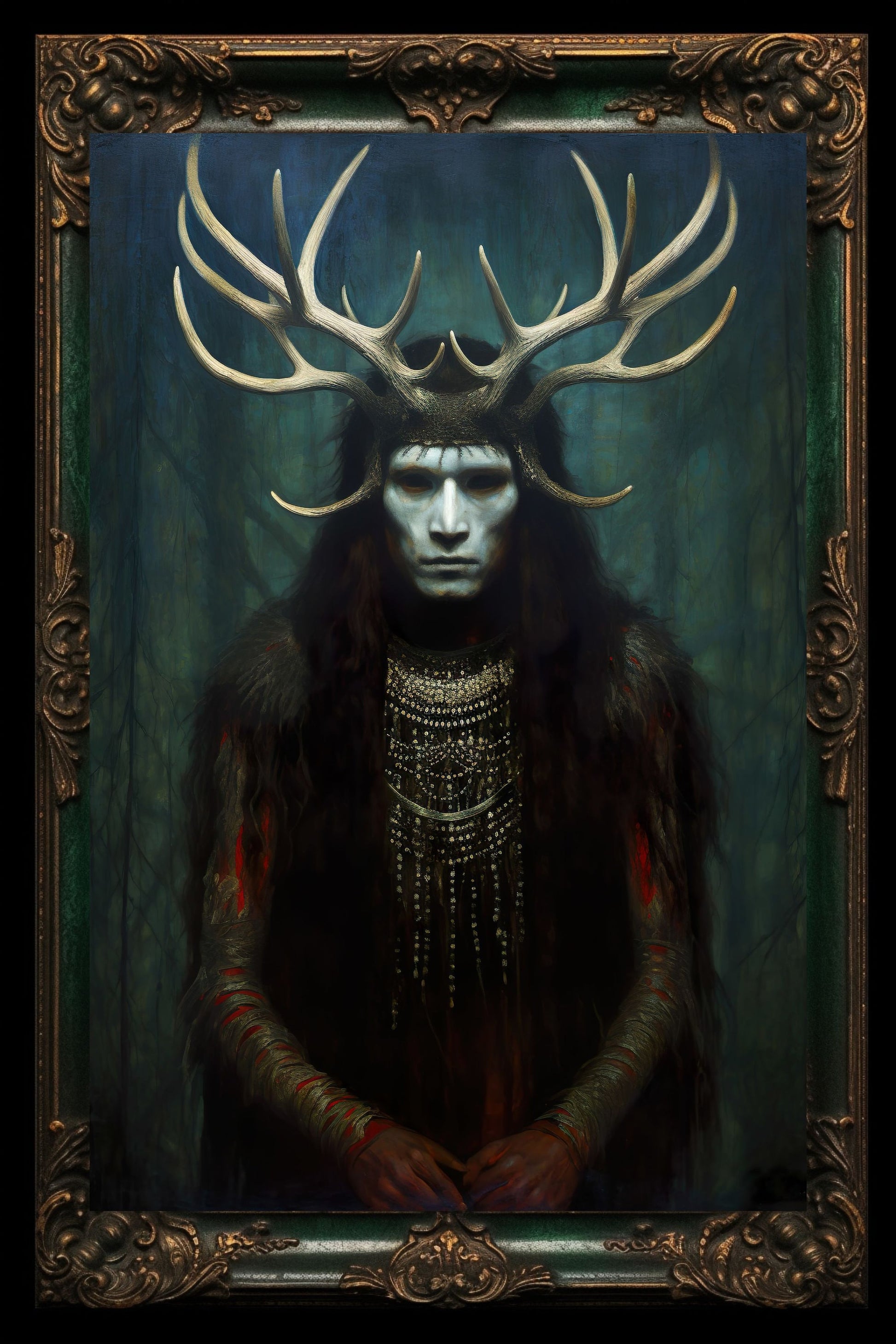Step into the chilling embrace of the Canadian wilderness with "Wendigo Whispers," a haunting portrayal of the elusive Wendigo spirit. This enigmatic masterpiece captures the essence of this Northern legend, blending ancient folklore with contemporary artistic allure.