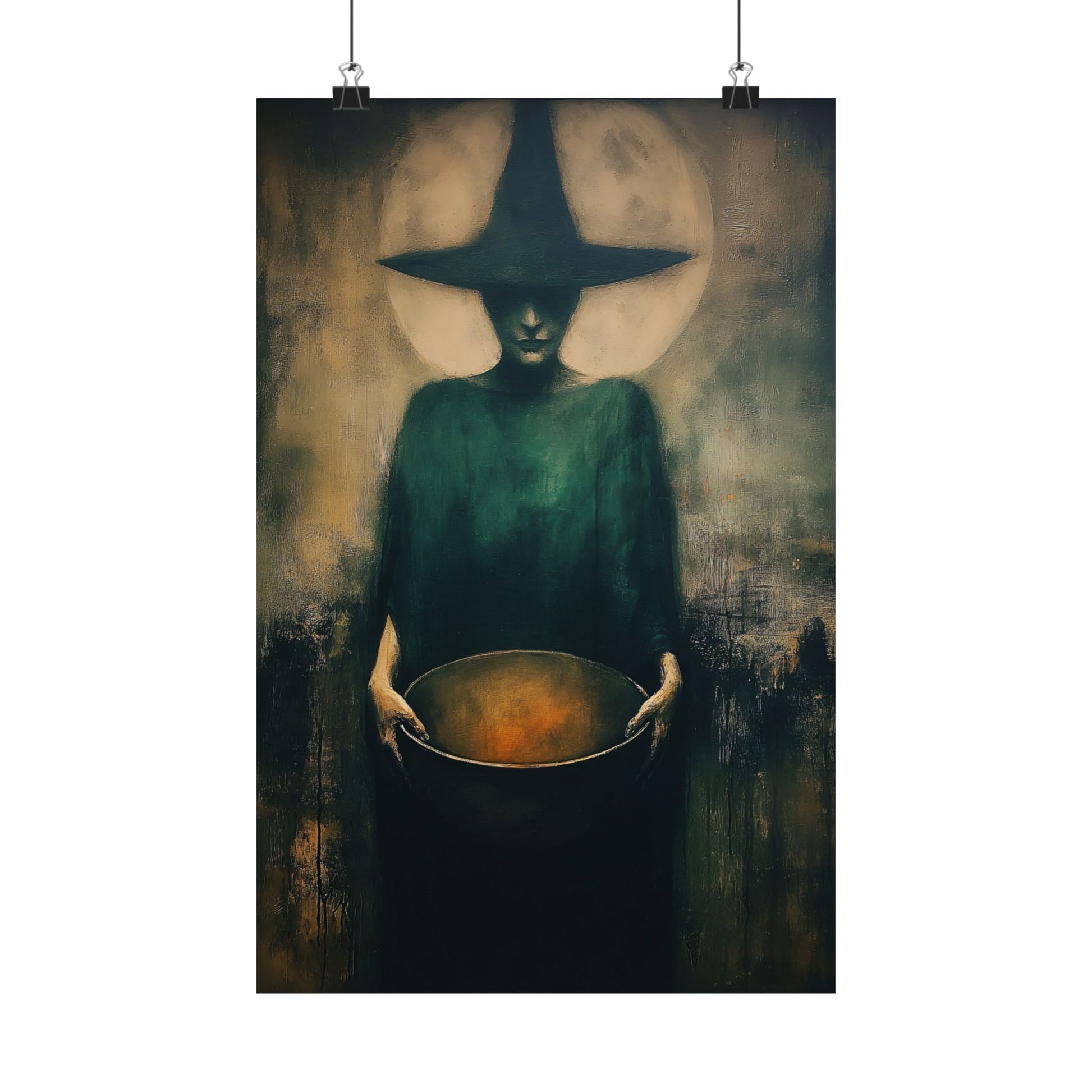 A solitary witch stands shrouded in shadow, her wide-brimmed hat eclipsing a glowing full moon. In her hands, she cradles a coppery cauldron—empty, waiting, sacred. This evocative art print channels the essence of Samhain: mystery, power, and ritual. Her expression is unreadable, her presence commanding—an invitation to step into the dark and cast your own spell.